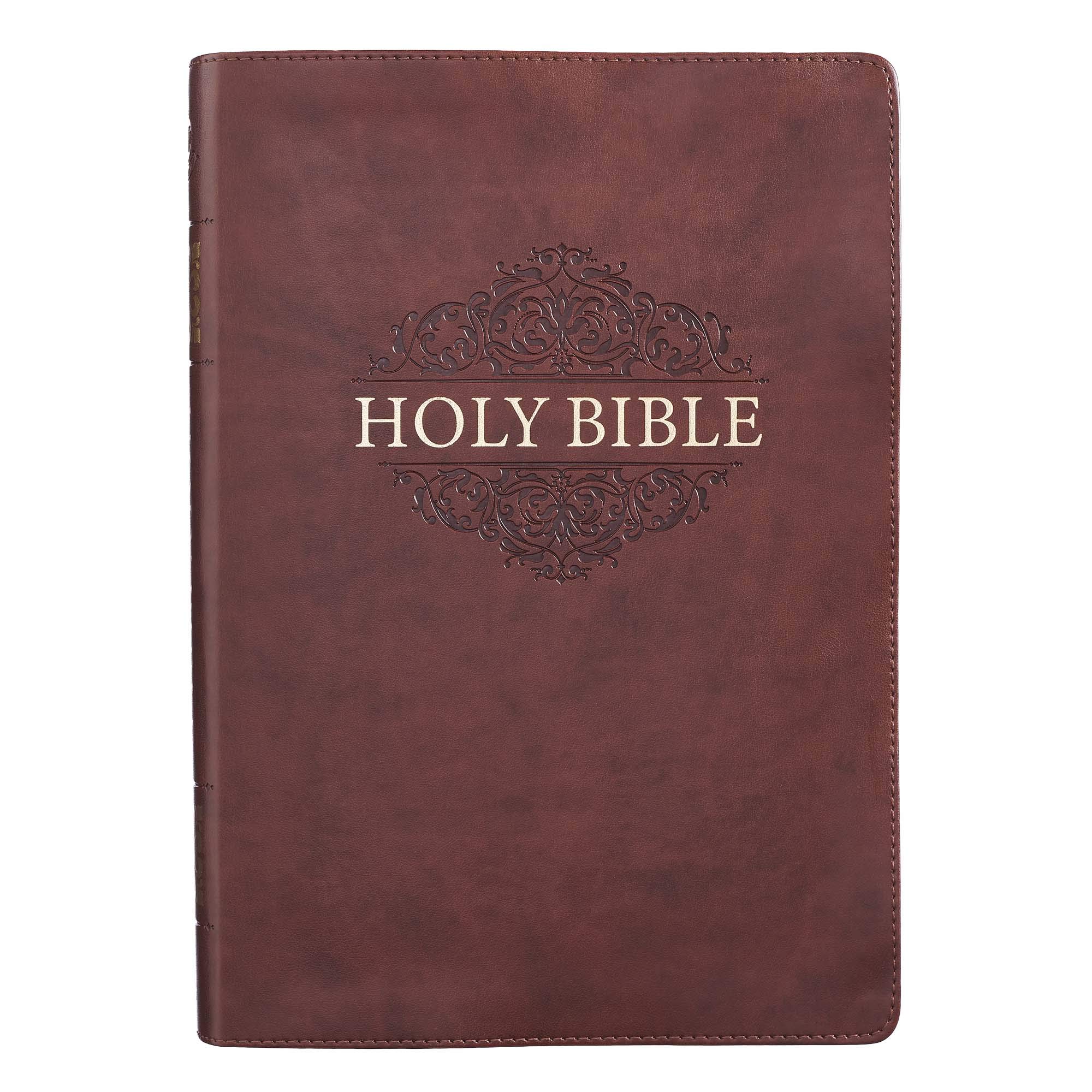 This Brown Faux Leather Super Giant Print King James Version Bible is bound to become your favorite Bible. The handsome, smooth brown faux leather Bible features gilt-edged pages and an attached brown satin ribbon page marker to enhance the beauty of the simple design. The title is heat debossed and gold foiled on the front cover and sandwiched between two ornate filigree scroll flourishes. HOLY BIBLE The spine is marked with the same gold foiled title and two gold foiled four-square floral emblems. Topstitching around the edges of the bible lends durability. With an easy to read 17-point type in a double-column format and footnote cross-reference guide, concordance and thematic Scripture verse finder, you'll find this Bible an excellent tool for study and readable without strain. The words of Christ are printed in red ink, and there are eight full-color annotated biblical maps. The Giant Print Bible also features a presentation page that you can complete with a special encouraging message when giving it as a gift. The Brown Faux Leather Super Giant Print King James Version Bible comes packaged in a sturdy box to protect it and makes a great gift for Christmas, First Communion, Baptism, or confession of faith. Features Include: Classic King James Version Brown Faux Leather Cover Gold Foiled Heat Debossed Title and Cover Design Flexcover Text Size 17-point Type Gilt-Edged Pages Attached Brown Ribbon Marker Double-column Format Lay-Flat Binding Words of Christ in Red Ink One-Year Bible Reading Plan Thematic Scripture Verse Finder Concordance Cross-referencing 8 Full-Color Maps Presentation Page Packaged in Gift Box Size: 10.6" x 7.5" x 1.6" (269 x 191 x 41mm) The KJV is the best-selling book in the English language and Christian Art Gifts KJV Bibles feature the timeless text that seamlessly blends with modern lifestyles to demonstrate the continuing value of the KJV Bible. Christian Art Gifts offer a wide variety of KJV Bible accessories. From Bible Covers, Coloring Books, Journaling Bibles, Journals, Planner and Devotional Books, the company strives to bring the best quality products with a special message on each one.